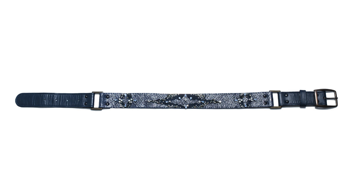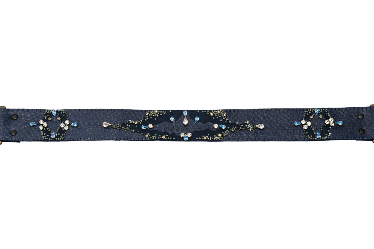 Materials: Salmon leather, suede, Czech glass beads, Swarovski crystals, brass (buckles and rings)